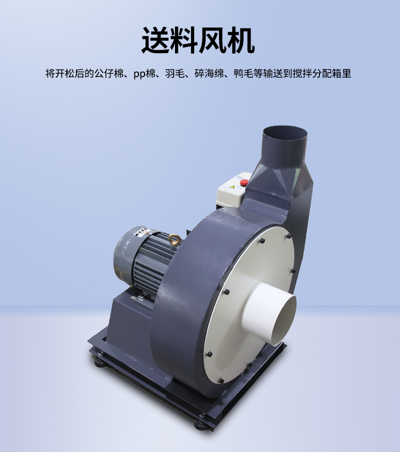 1.送料風機將開松后的公仔棉、PP棉、羽毛、碎海綿、鴨毛等輸送到攪拌分配箱里。